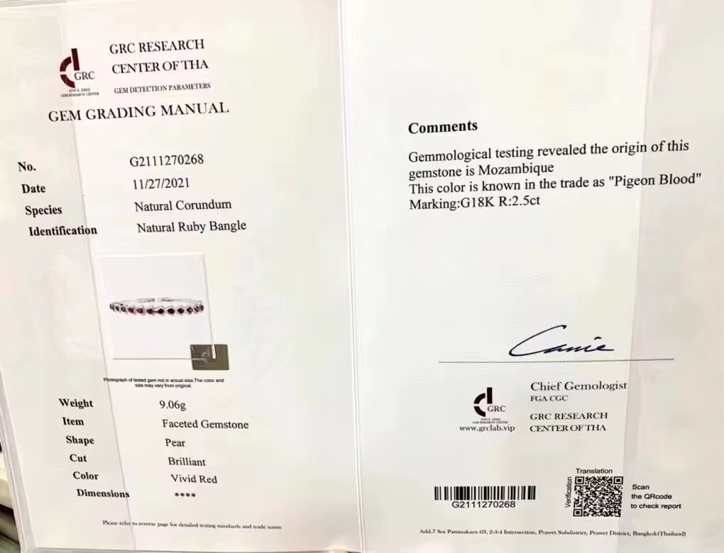 Indulge in pure luxury with our 18k White Gold Pigeon Blood Red Ruby Bangle Bracelet. Adorned with a GRC certified red ruby and natural diamonds, this exquisite piece exudes sophistication and exclusivity. Elevate your style and make a statement with this stunning bangle bracelet.