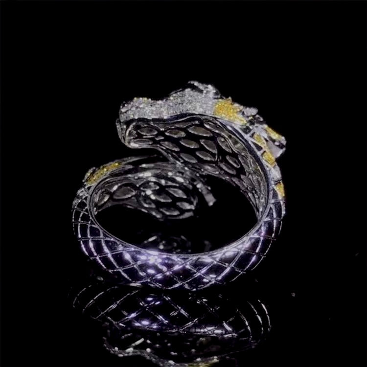 This 18k white gold ring features a stunning pigeon blood red ruby gemstone and sparkling diamonds, set in a striking dragon design. Elevate your engagement with this luxurious piece that exudes sophistication and artistry. A symbol of strength and passion, this ring is perfect for the one-of-a-kind love in your life.